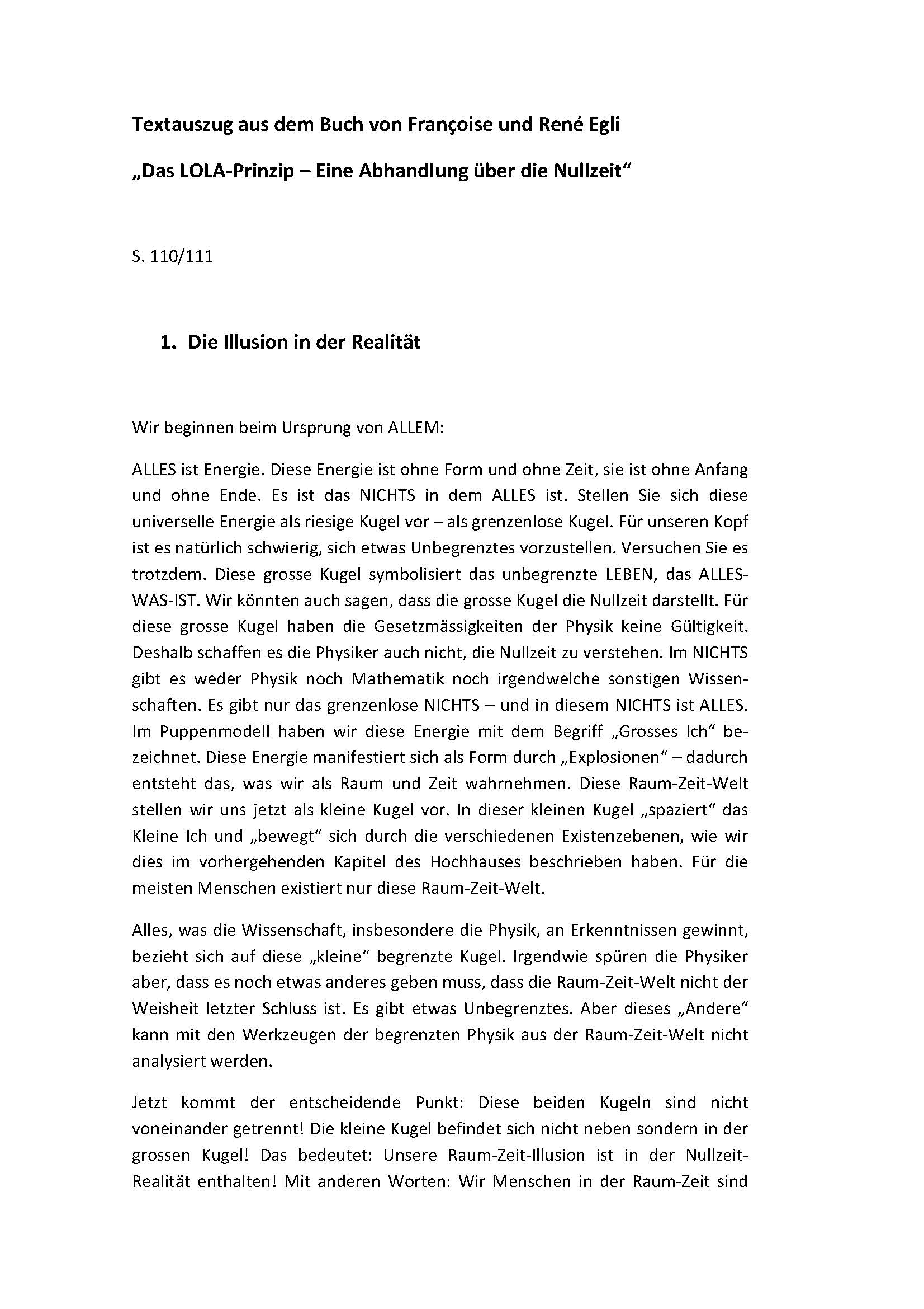 „Eine Abhandlung über die Nullzeit.“ Viele Menschen sind auf der Suche nach dem Urgrund allen Seins. Der Glaube allein genügt nicht mehr. Selbst der Glaube an die Allmacht der Physik wurde durch immer neue Erkenntnisse massiv in Frage gestellt. Viele Wissenschafter stossen an die Grenzen des rational Erfassbaren. Was befindet sich „jenseits“ unserer bekannten dreidimensionalen Raum-Zeit-Welt? Die Nullzeit! Das Paradies! Der Zentral- und Angelpunkt aller Überlegungen in diesem Buch ist die Erkenntnis, dass es in Wirklichkeit keine Zeit gibt. Die daraus ableitbaren Konsequenzen sind geradezu dramatisch. Françoise und René Egli zeigen, wie man praktisch mit diesem Unfassbaren, mit dem Grenzenlosen in seinem Leben umgeht.