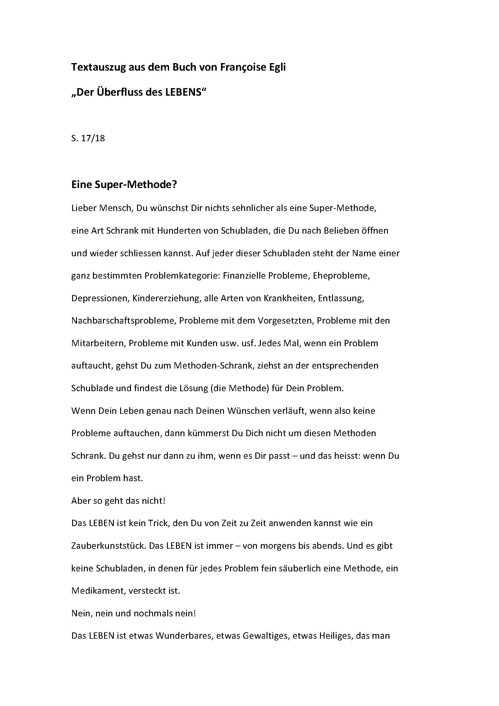 In jedem Augenblick unseres Lebens, kürzer als ein Atemzug, sind wir entweder mit dem Überfluss des LEBENS oder mit dem Mangel konfrontiert. Vergessen Sie ganz einfach ALLES, was Sie bisher über das Thema „Reichtum“ gehört oder gelesen haben und treten Sie ein in die Welt des Überflusses. Dieses Buch enthält auch „Die Geschichte vom Grossen und Kleinen Ich“. Sämtliche Texte und Zeichnungen stammen von einem Menschen, der nicht weiss, was Mangel ist: von Françoise Egli.