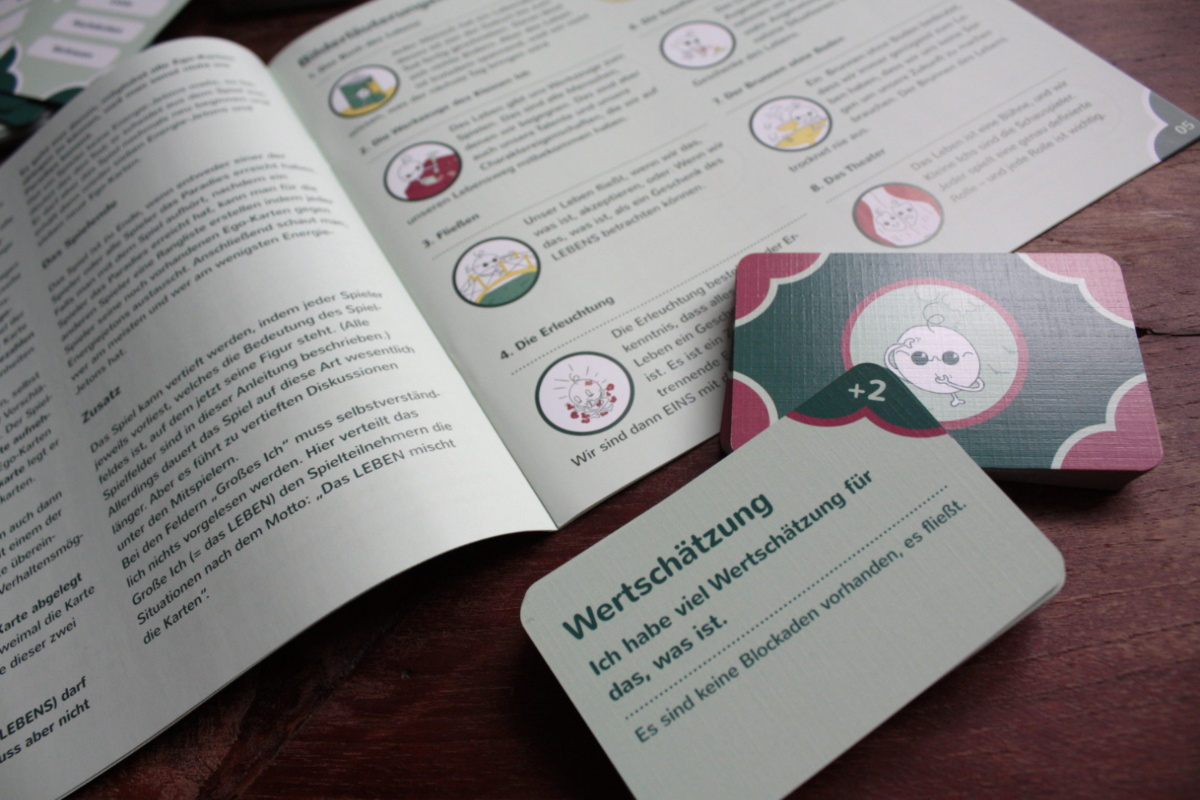 Bei diesem Spiel geht es darum, mit seiner Figur ins Paradies zu gelangen (Feld 63). Auf dem Weg zum Paradies stellen sich uns aber zahlreiche Hindernisse in den Weg. Über das Spiel verteilt gibt es Felder des Grossen Ich. Wer mit seiner Figur auf ein solches Feld kommt, muss eine Karte ziehen. Auf dieser Karte ist ein angenehmes oder unangenehmes Ereignis beschrieben (wie im richtigen Leben). Auf dieses Ereignis muss der Spieler jetzt reagieren. Vom Spiel werden pro Ereignis vier verschiedene Verhaltensweisen vorgegeben – so lernt der Spieler, dass man auf ein bestimmtes Ereignis auf verschieden Arten reagieren kann. Und je nachdem wie die Reaktion ausfällt gewinnt oder verliert man Energie.